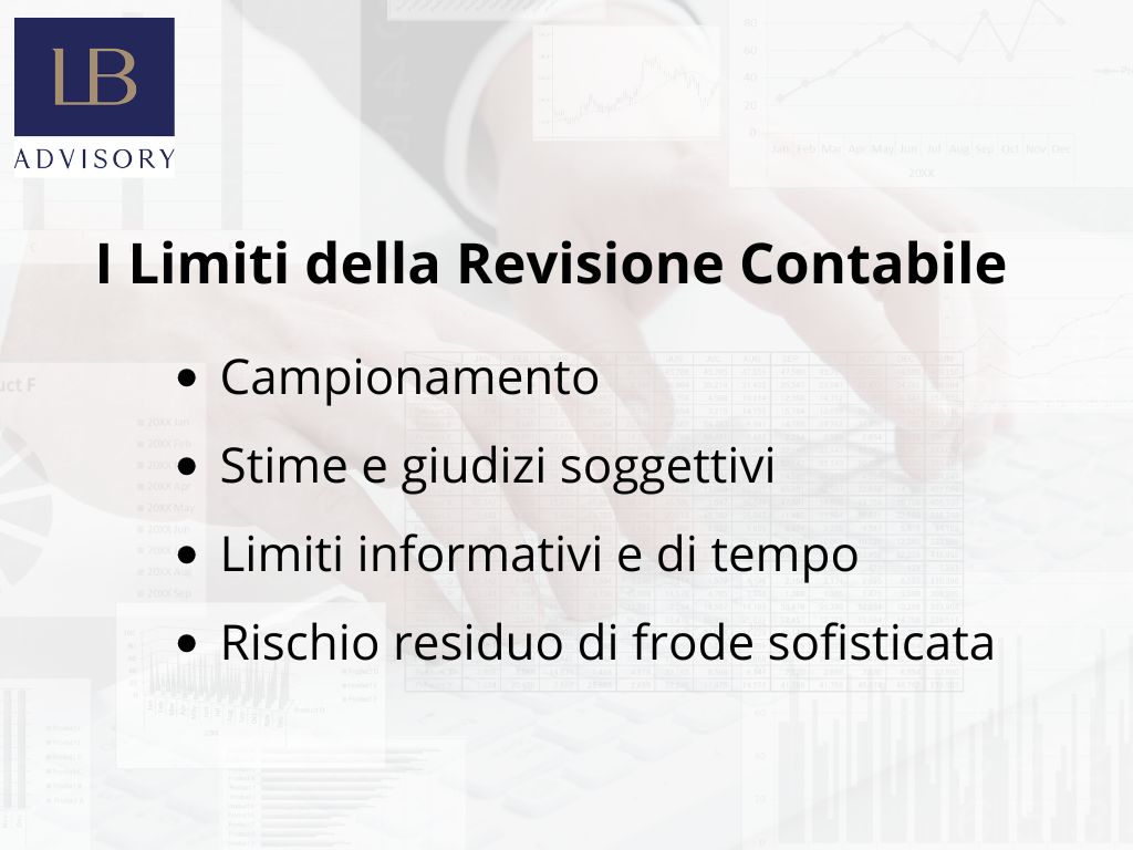 • Rischio residuo di frode sofisticata: la revisione può non individuare frodi particolarmente ben orchestrate, soprattutto in presenza di collusione interna tra gli amministratori o di pratiche fraudolente molto evolute.