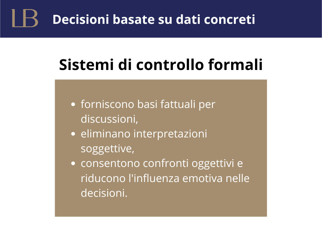 L'implementazione di sistemi di controllo formali diventa necessaria durante la professionalizzazione, la crescita dimensionale e il passaggio generazionale. Questi sistemi supportano il decision-making, aiutando a cogliere opportunità e sviluppare strategie basate su evidenze concrete. I numeri offrono vantaggi specifici: